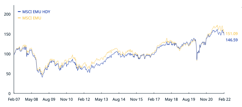 Regardons la performance d’un panier d’actions éligibles au PEA telles que celles figurant dans l’indice MSCI EMU High Dividend Yield :
