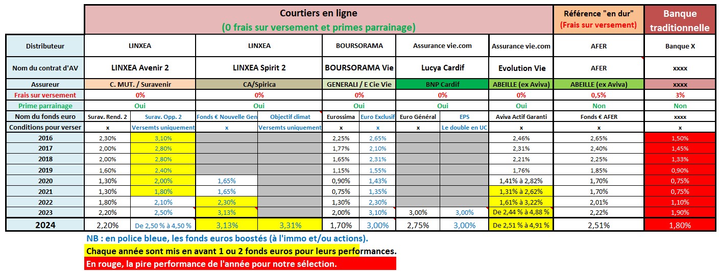 Avis de Nicolas : n’ayez pas crainte des courtiers en ligne (Linxea, Lucya, Placement-direct, etc.). Ce sont des établissements bien établis depuis plus de 20 ans à Paris. Et ils ont négocié pour les épargnants les contrats aux meilleures conditions. Et puis notre argent est chez l’assureur, pas chez le courtier qui n’est qu’un intermédiaire.