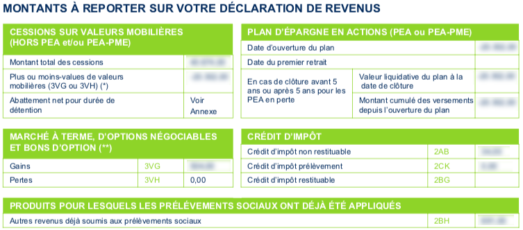 Voici un exemple du type d’informations que l’on retrouve dans un imprimé fiscal unique. Sachez que l’on trouve bien d’autres informations dans l’IFU, notamment pour compléter les cases 2DH, 2EE, 2DC, 2FU, 2CH, 2TS, 2GO, 2TR, 2CG, 2BH, etc, de la déclaration d’impôt sur le revenu. Ce document est d’une aide précieuse. Opter pour un broker mettant un IFU à disposition de ses clients est un réel avantage en termes de gain de temps et de sérénité.