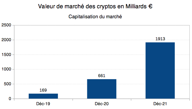 Investir en cryptomonnaie n’est plus une lubie de geeks. La vénérable banque JP Morgan, longtemps dubitative face aux cryptomonnaies, recommande maintenant à ses clients fortunés d’investir 1 % de leur patrimoine en cryptomonnaie. Ce changement d’opinion n’est pas anodin. Investir en cryptomonnaie devient un sujet sérieux. De même, Blackrock (plus grand gestionnaire d’actifs au monde) propose à ses clients d’investir en cryptomonnaie. Le marché des cryptomonnaies a connu une croissance fulgurante et s’institutionnalise, voyez l’évolution de 2019 à 2021 :