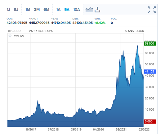Le cours du Bitcoin en dollar (USD) sur ces 5 dernières années (source : Boursorama) :