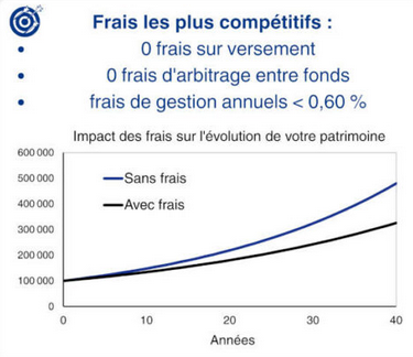 Donc vous auriez mieux fait de payer des honoraires de conseil (CGPI au conseil indépendant), pour avoir une étude complète puis (entre autres conseils) un meilleur contrat sans frais sur versement, moins de frais de gestion annuels, l’accès aux meilleurs fonds d’investissement et au crédit Lombard. Regardez le résultat sur votre patrimoine sur la durée, cela peut représenter plus de 100 000 € d’écart sur 30 ans :